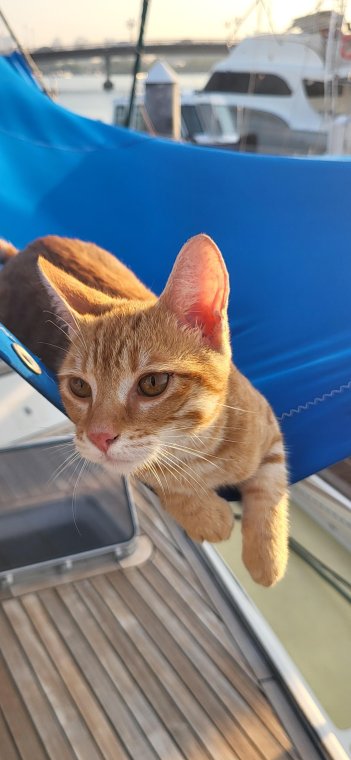 Kattepusen har også kost seg, og hoppet fra båt til båt og løpt nedover kaia. Hun har fått enormt med oppmerksomhet av alle de bevæpnede sikkerhetsvaktene, som alle har smilt litt godt hver gang hun har fulgt etter oss som en liten hund, helt til enden av kaia, liksom for å si ´ha det´ hver gang vi har gått ut. Og så har hun kommet løpende igjen når vi har kommet tilbake. Hun har dratt med seg småfisk og papirkvitteringer hjem stort sett hver natt, blitt jaget av den største av hundene - og vært ute i vannet 7 ganger. Vi vet ikke helt hvordan hun har klart det, men hun har nå klart å kave seg ut av vannet, opp på kaia og tilbake til båten hver gang - dryppende våt. Og har da kommet opp i senga, dryppende våt, tydeligvis for å fortelle at hun har vasket seg.....